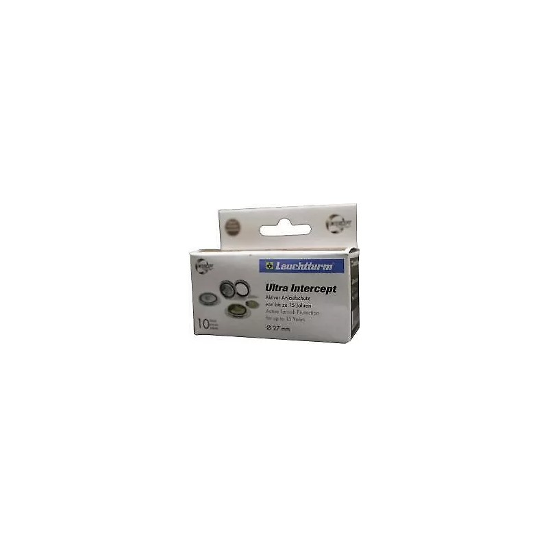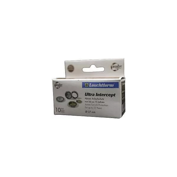 Ultra Intercept - Premium capsules with Intercept rings for active protection against tarnishing Ultra Intercept are the world's only round coin capsule offering the added benefit of active tarnish protection. Sold in packs of 10 by mm size. The patented Intercept Technology material is applied to a chemically inert EVA foam ring and combined with an ultra-clear rimless capsule. Regular capsules limit a coin's exposure to ambient air and moisture. The highly porous, copper-based Intercept Technology material does even more: it locks in corrosive gases and provides active protection from tarnishing for up to 15 years, significantly longer in favorable storage conditions, such as cool and dry areas without extreme changes in temperature and humidity. Premium clarity, scratch resistant, rimless capsule Secure locking, yet easy to open due to thumb cut Chemically inert EVA foam insert treated with Intercept Technology Non-toxic, free of PVC, acids, and chemical softeners Compatible with many storage solutions