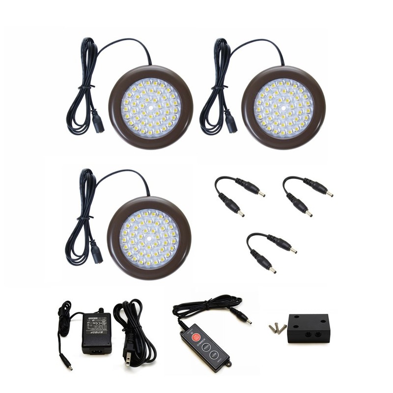 - Includes: (3) 3.5 inch Warm White 3000K LED Puck Light, 12 Watt Power Supply - Link up to (4) 3.5 inch LED Puck Light, Dimmer Switch, 4-Way Splitter, (3) 4inch Interconnect Cable, and (3) Mounting Screws.