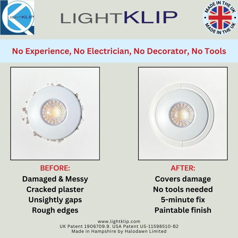Lightklip - 1 Light Pack - Easy Fix for Damaged Plaster Around Recessed Lights - No Tools, No Electrician Needed.