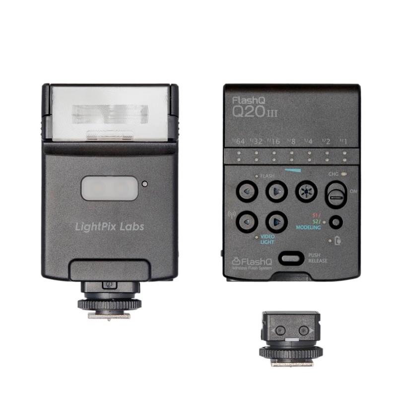 • The Flash Q Q20III is a compact, thin, and easy-to-use flash that works wirelessly. Not only can you use it as a regular clip-on strobe, it can also be used as a wireless off-camera flash by removing the transmitter from the main unit