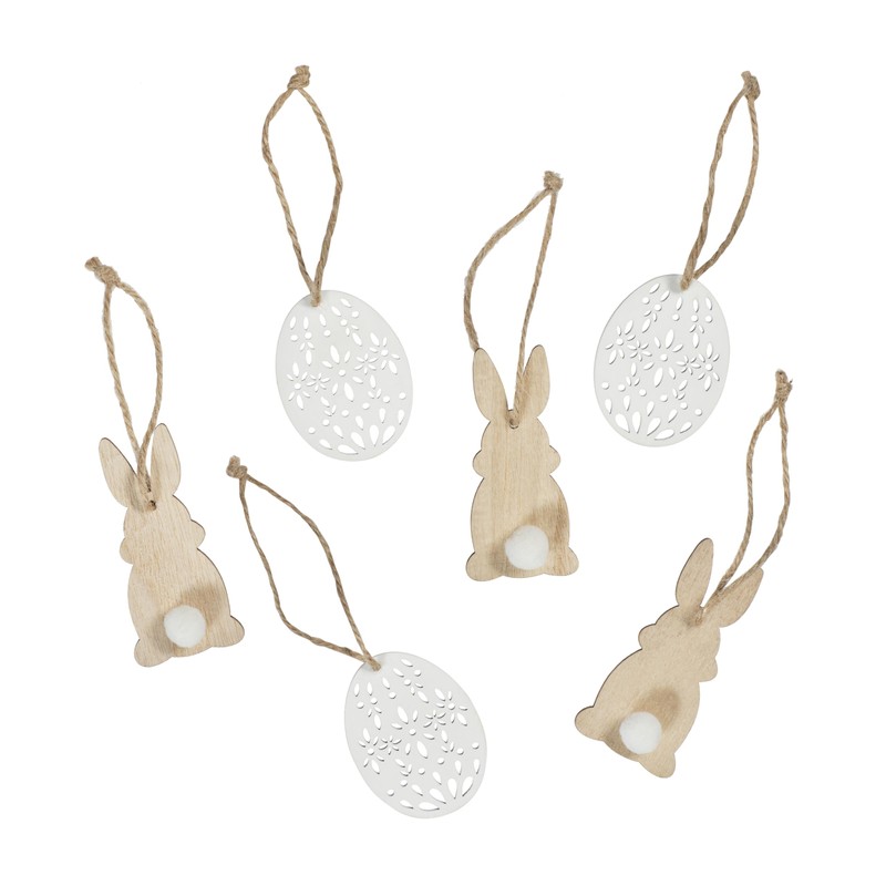 - RUSTIC EASTER DECORATION: This set of 6 wooden decorations features 3 white-painted egg shapes with intricate cut-out patterns and 3 wooden bunny silhouettes with adorable pom-pom tails, combining simplicity and charm.