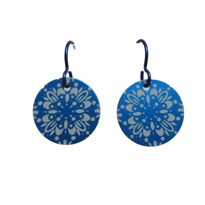 Lightweight Anodized Blue Floral Aluminum Disc Niobium Dangle Earrings