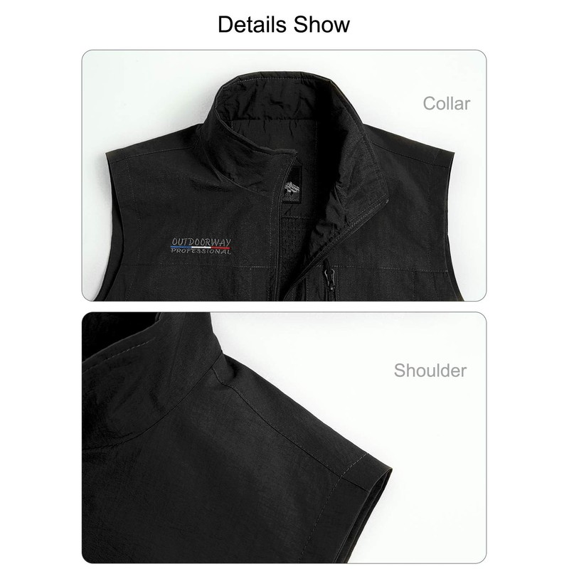The sleeveless jacket features multi-function pockets, 2 side pockets with zippers, 2 chest pockets, and 2 inside pockets with Velcro