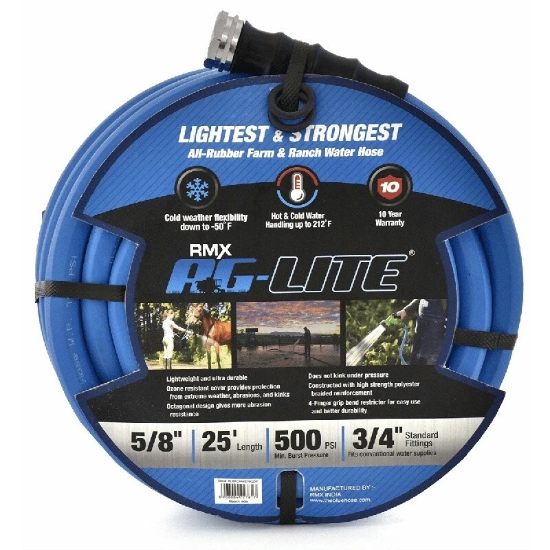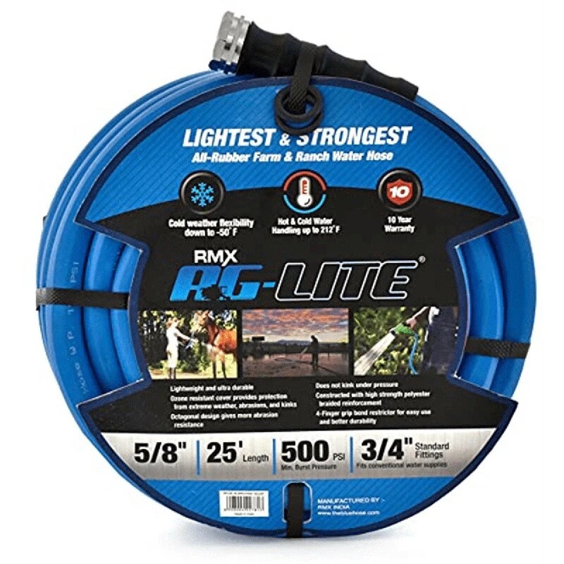 The lightest and strongest rubber garden hose on the market. HIGH STRENGTH AND PRESSURE: 500 PSI max pressure. Can run both hot and cold water. Hot water up to 200F. Ideal for both home, farm and ranch use. COLD WEATHER FLEXIBILITY: The best cold-weather flexibility in its category, down until -50F. No chance of cracks with an ozone resistant cover that provides protection from extreme weather and UV. Resistant to abrasion and kinks. FITTING : AG-Lite's revolutionary end fitting design fits all 3/4" GHT conventional style outlets and water equipment. EASE OF USE: Each hose comes with a 4 Finger-grip bend restrictor to avoid damage at ends.