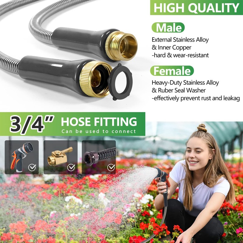 - Heavy Duty Stainless Steel Water Hose: The metal garden hose is made from premium 304 stainless steel, which is a corrosion-resistant and rust-resistant material. This garden hose is built to last and withstand tough outdoor conditions. It can handle high pressure and heavy use without breaking or leaking.