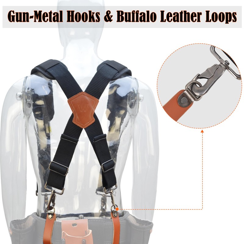 - ✔️Easy-to-attach: 4-piece buffalo leather loops for hook on belt suspenders. The 10mm padding of these work suspenders for men tool belts provides ultimate comfort and weight distribution.