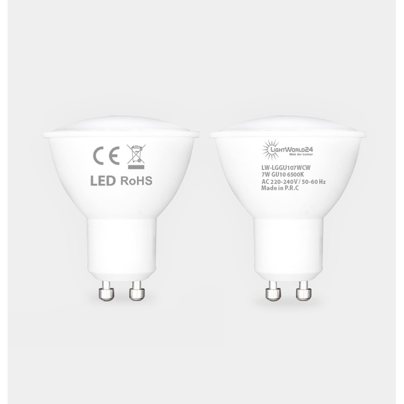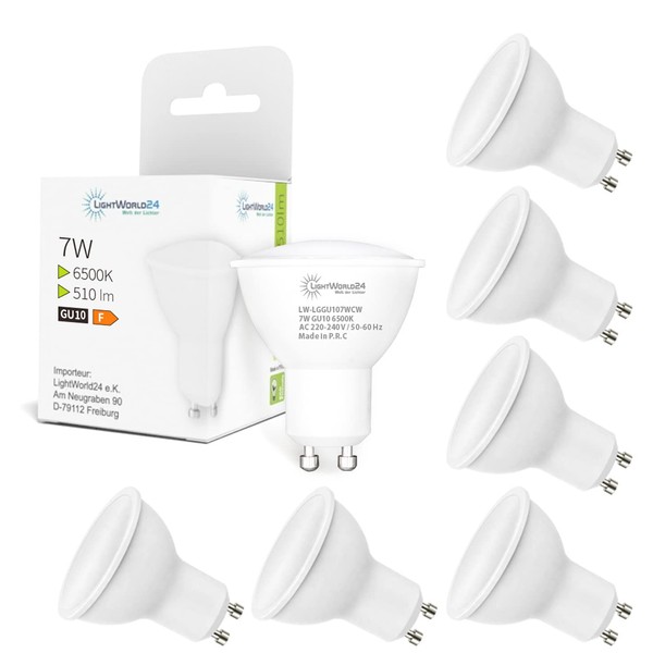 LIGHTWORLD24 Welt der Lichter GU10 LED Cool White 7 Watt Reflector Lamp Not Dimmable 510 Lumen LED Lamp Replacement for 50 W Halogen Bulbs 6500 K, 120° Beam Angle Spotlight, AC 230 V, Set of 6