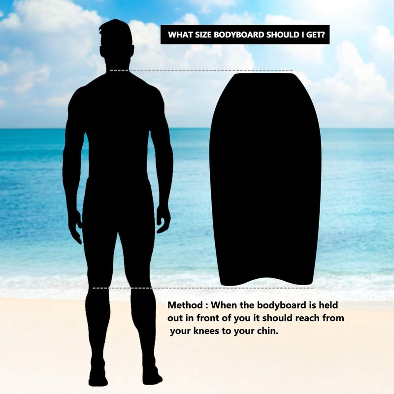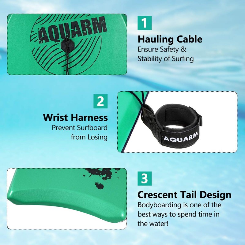 • 𝗦𝘂𝗽𝗲𝗿𝗶𝗼𝗿 𝗦𝘂𝗿𝗳𝗶𝗻𝗴 𝗘𝘅𝗽𝗲𝗿𝗶𝗲𝗻𝗰𝗲: Our body board is designed with a focus on stability and glide for easy glide with maximum enjoyment. The crescent tail helps you to control easily and can stand or lie on it more stably. The board is built for experiencing the ocean for the first time