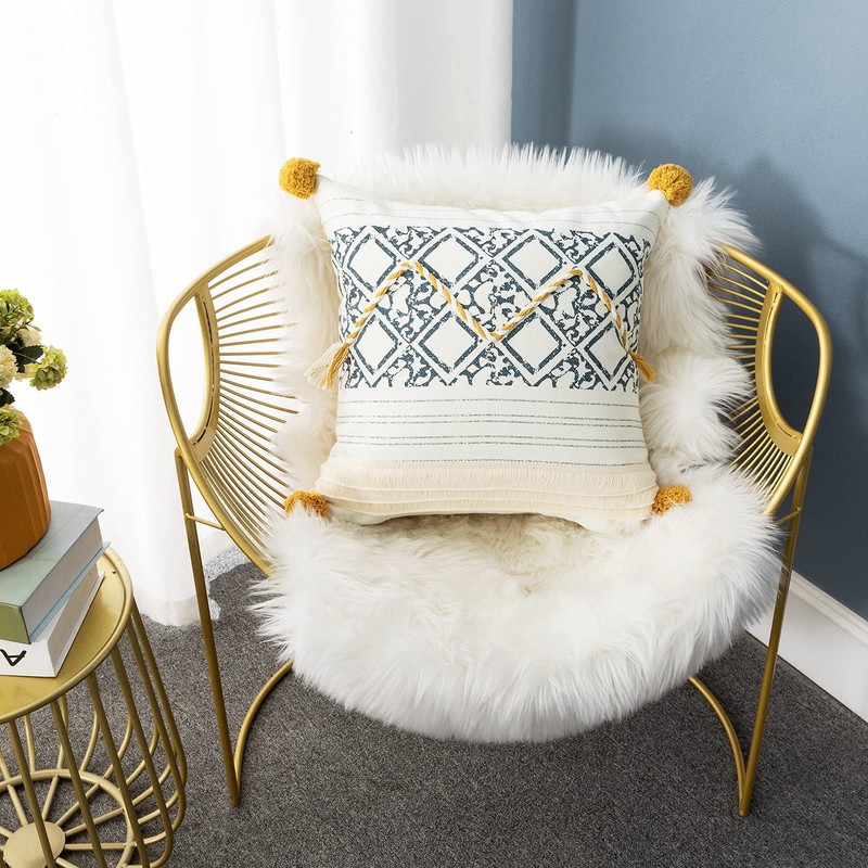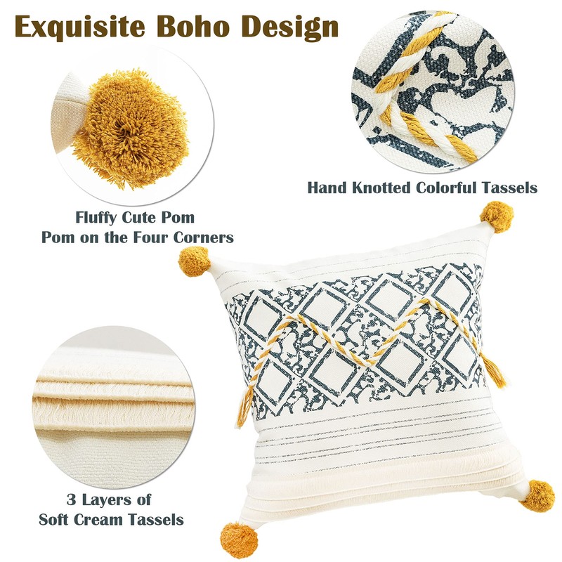 - Unique Modern Design - These throw pillow covers have a designer look and feel. A textile fabric with an interesting and tribal design. Pairs well with Bohemian, ethnic , retro and chic style decors. Using weaving, printing, pom poms and tassels craftsmanship, stylish and elegant. The fantastic quality and rich texture of this material add charm and interest to any room whether your look is a casual cottage, rustic farmhouse, or a transitional blend.