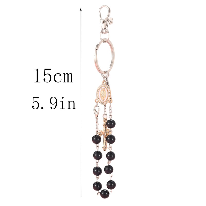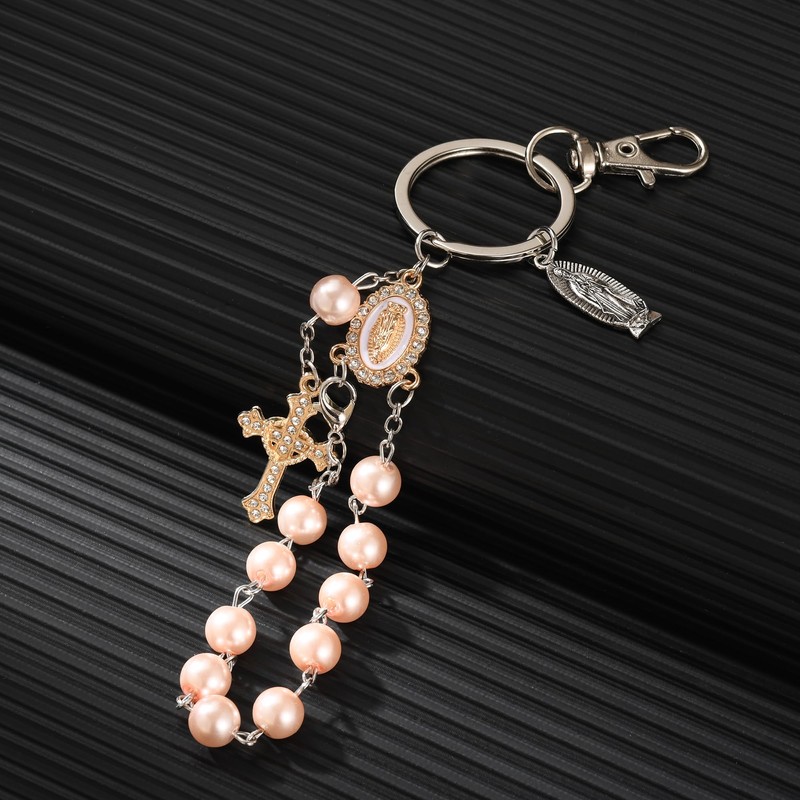 - VERSATILE SET: Complete set of 4 decorative keychains featuring pearl-style beads in black, white, red, and blush pink colors with religious pendants
