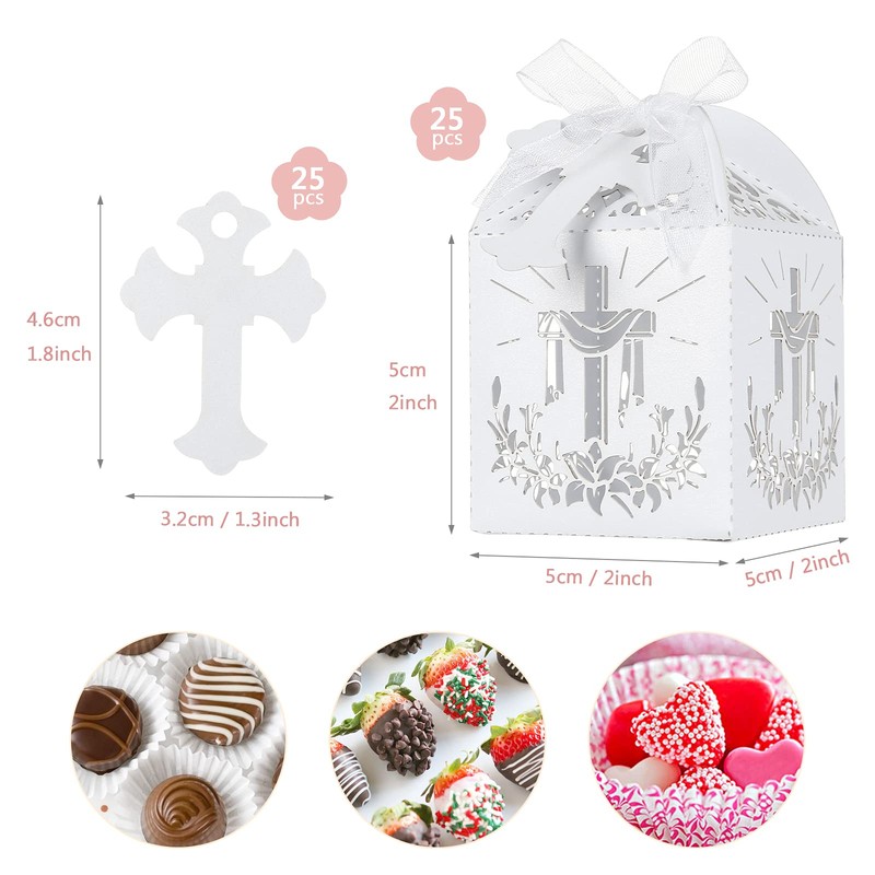 LIHAO 25 PCS Baptism Favor Boxes Laser Cut Candy Treat Box with Ribbons for Wedding Christening Baby Shower Christmas Party