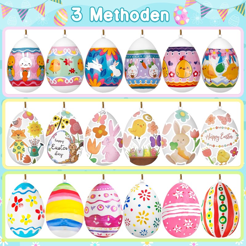 LIHAO Pack of 12 Easter Eggs for Painting White Eggs for Hanging Easter Decoration with Shrink Film Pens Sticker Easter Egg Colour Crafts
