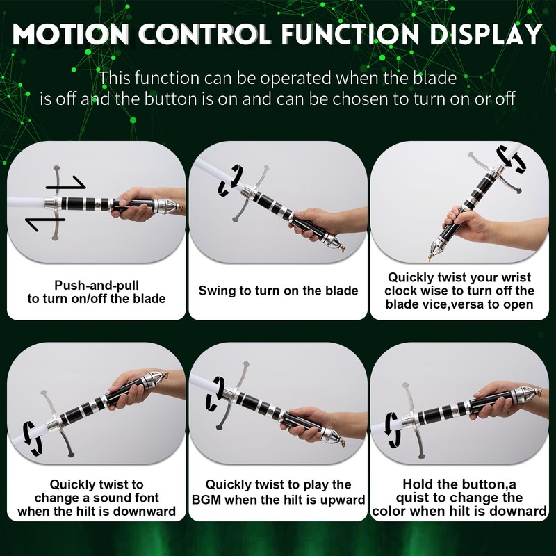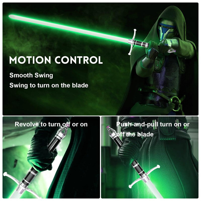 • 🔥[Upgrade Version Light Saber] :① Motion Control: lets you turn on or off the blade by pushing and pulling, twisting or swinging. ② Smooth Sensitive Swing technology added realism by giving off that sound and light flash each time lightsaber blade touch something automatically, light saber will stunning and deflected a blaster while swinging in the dark.③3 volume settings (High, Low, Mute).