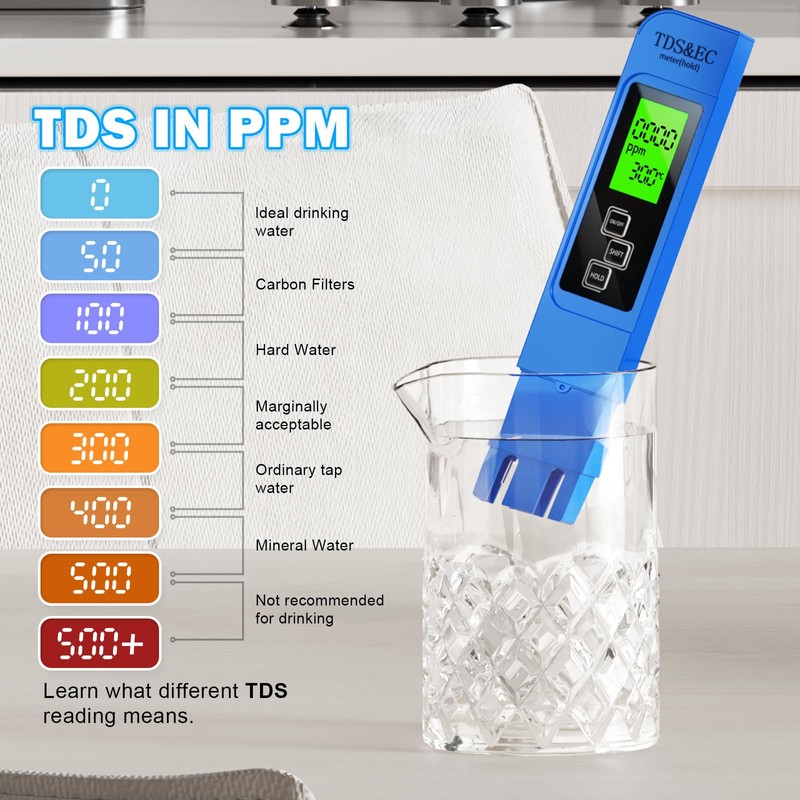- MULTIFUNCTIONAL (4 IN 1) & 5 UPGRADED 4 in 1 TDS Meter, Electric Conductivity Meter & Temperature (C,F)Meter features the most updated technology.Upgraded with big backlit LCD for easier reading, auto-lock function for easier use, factory calibrated and hold function for direct use and auto-0ff in 2 minutes to conserve battery. These enhancements make it a user-friendly tds meter digital water tester for a variety of applications