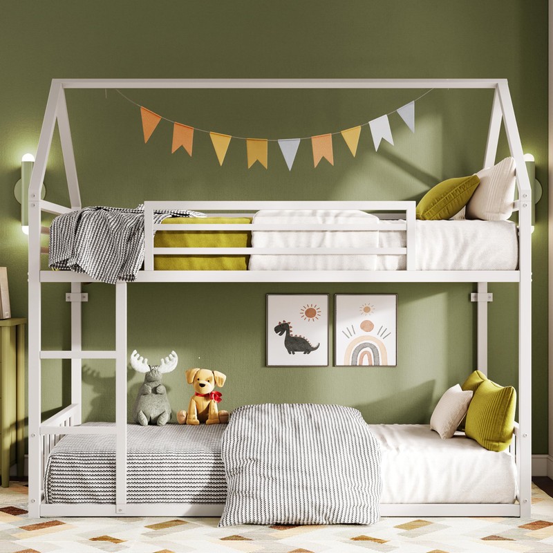 LIKIMIO Bunk Bed Twin XL Over Twin XL, Metal Bunk Bed Frame with Ladder and Guardrail, House Shaped with Metal Slats for Dormitory and Bedroom, Space Saving, No Box Spring Needed, White