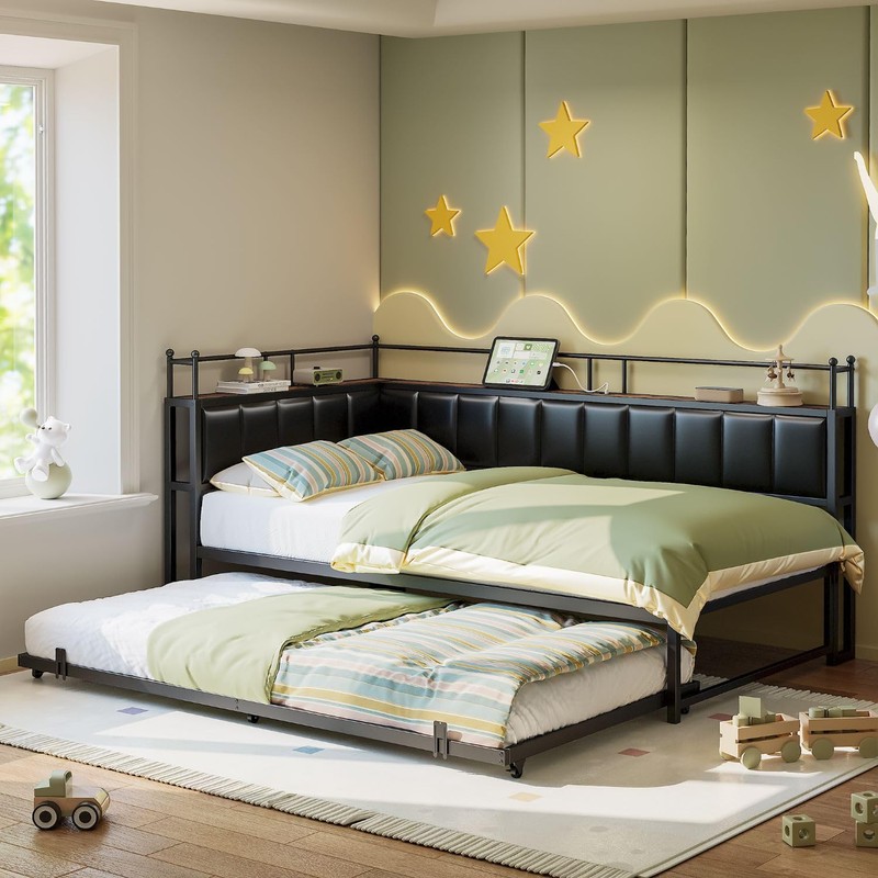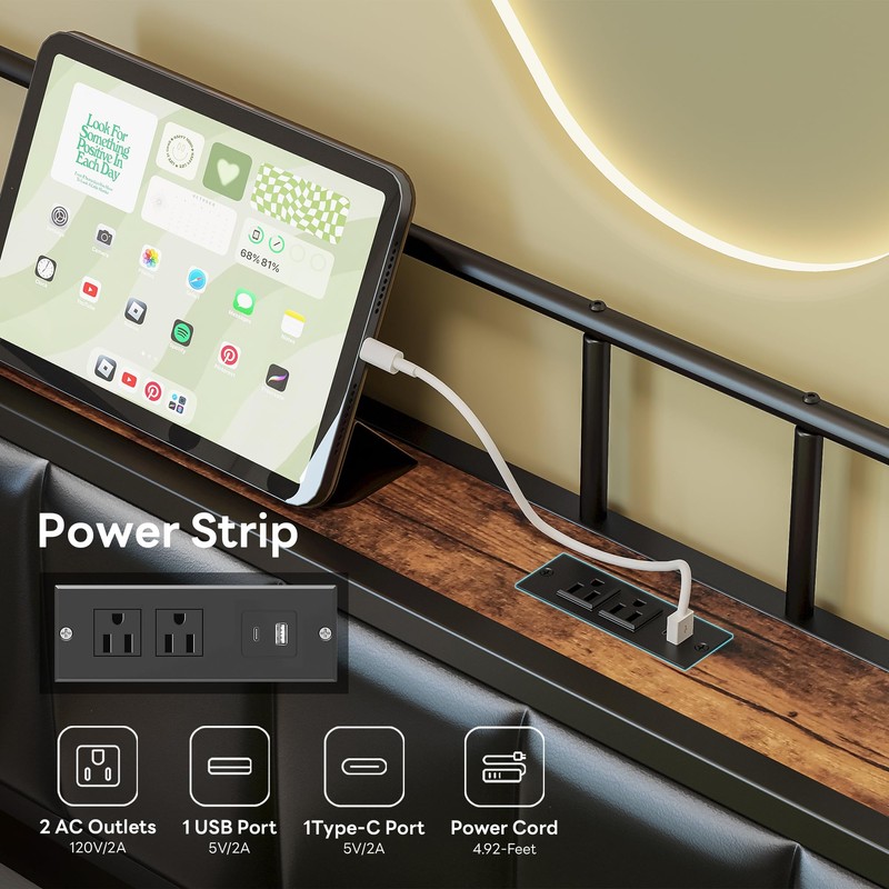 - Built-in Charging Station:The AC power supply (2 AC outlets + 1 USB port+1Type C) is located on the bedside of the twin corner bed, perfect for charging your phone, tablet, or headphones while entertaining in bed, provides a convenient spot to charge your devices overnight