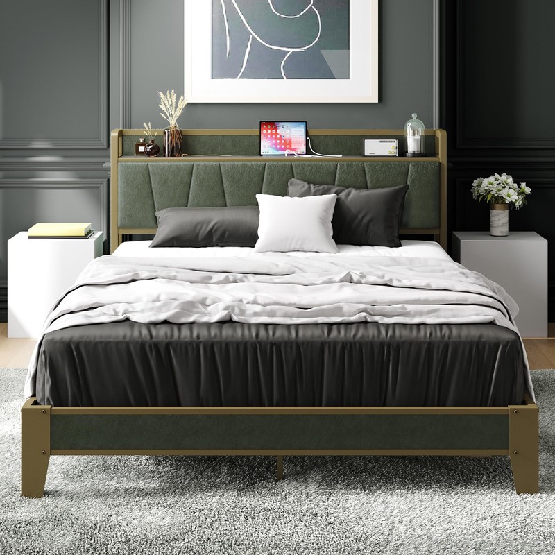 LIKIMIO Queen Bed Frame, Storage Headboard with Charging Station, Solid and Stable, Noise Free, No Box Spring Needed, Easy Assembly (Dark Green)
