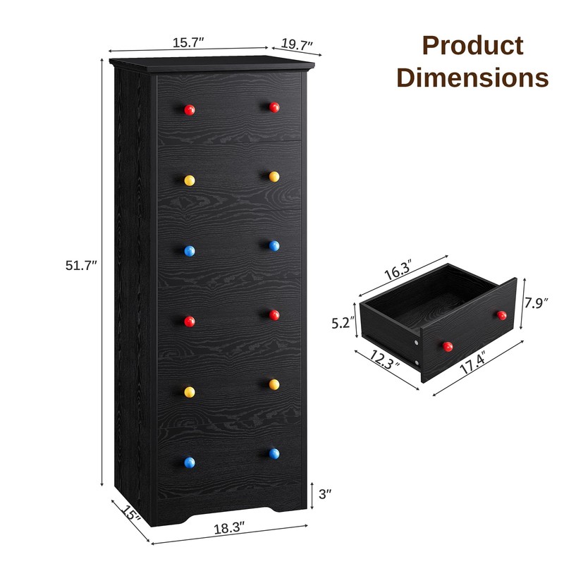 LIKIMIO Small Dresser Tall, 6 Drawer Tall Skinny Dresser with Colorful Handles, Chest of Drawers for Bedroom, 51.5" H Modern Wooden Floor Storage Cabinet with Metal Sliding Rail, Black