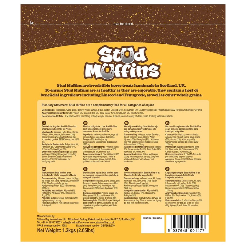 Product DescriptionDelicious Handmade Horse Treats Containing A Host Of Tasty Ingredients Including Oats, Barley, Wheat, Molasses, Linseed And Fenugreek. As An Extra Benefit, The Packaging Design Ensures They Stay As Fresh As The Day They Were Baked.Set Contains:1 x stud muffins 45 pack