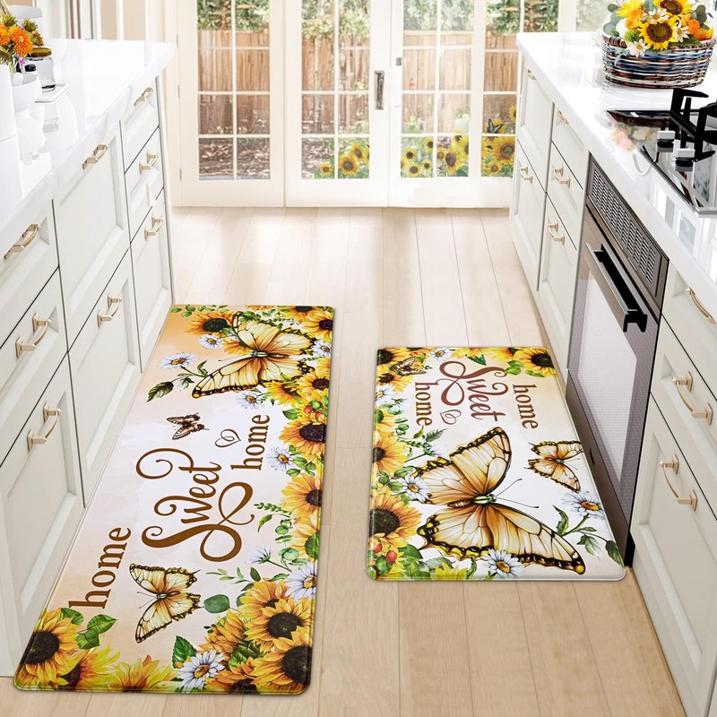 Likiyol Sunflower Kitchen Rugs Floral Kitchen Mats for Floor Butterfly Farmhouse Anti Fatigue Mats for Kitchen Floor, Non Slip Washable Kitchen Mat for Home, Sink, 18''x30''+18''x48''