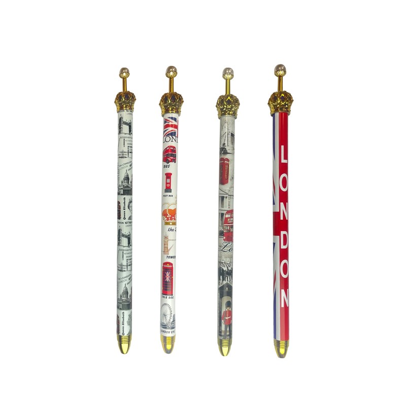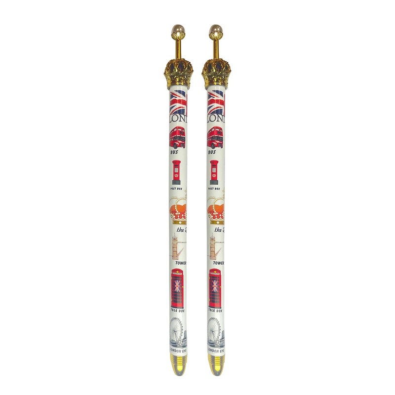 Adorned with a golden crown and a white clickable pearl, these pens feature iconic symbols like the royal guard, red telephone box, Union Jack, double-decker bus, and famous landmarks such as Tower Bridge, Big Ben, and the London Eye.