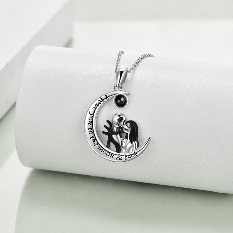 - ❤️ Sally and Jack Necklace I Love You in 100 Languages ❤️ The cute and simple necklace is full of Halloween fun! This design originates from The Jack and Sally. Crafted in sterling silver , the necklace shows a unique and eye-catching look. As a great Halloween and Christmas gift, the meaningful necklace celebrates your everlasting love. Engraved loving message " I love you to the moon and back".