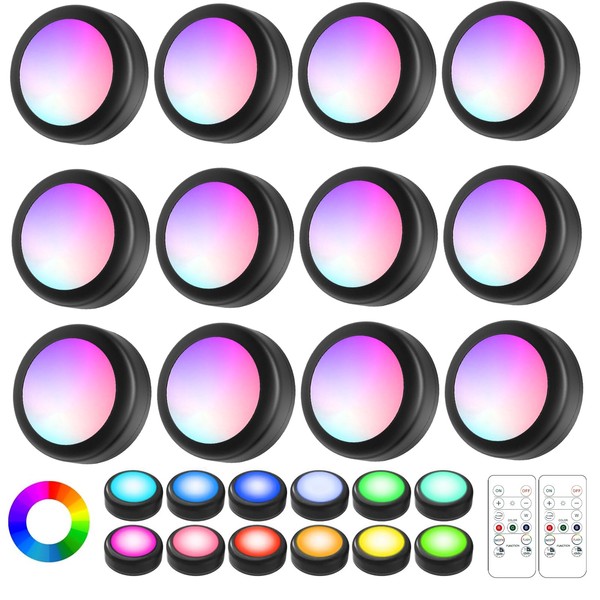 - 【Widely Used】Our battery Powered Lights have 16 changeable color for you choose.Package Includes:12 LED Puck Lights, 12 pieces of Adhesive Pads, 4 Remote Control, 1 User Manual.Great for your Kitchen, Closet, Bedroom, Cabinet, Bookcase, Pantry, Hallway, Stair, Step, Utility Room, Basement etc.Portable and Lightweight can be also used as emergency lights
