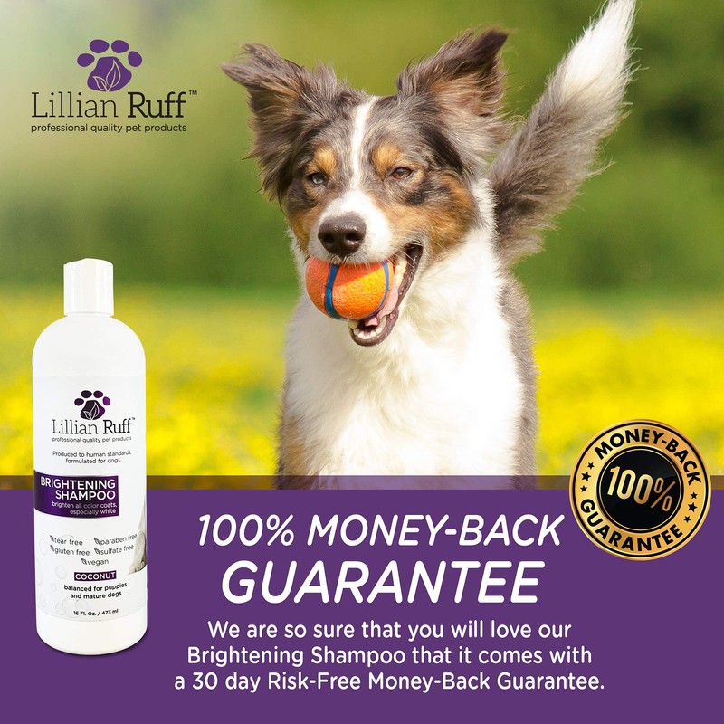 Lillian Ruff Brightening & Whitening Shampoo for Dogs – Tear Free Coconut Scent with Aloe for Dry & Sensitive Skin – Adds Shine & Luster to Coats (16oz with Bath Brush)