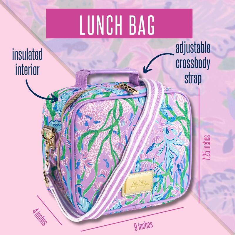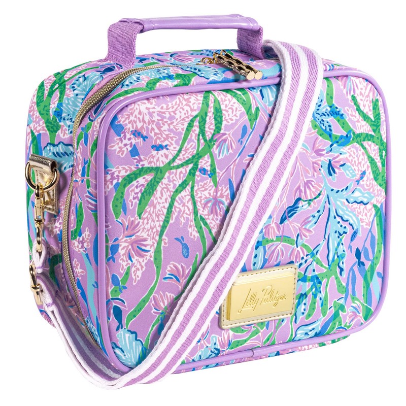 - Premium Design: Lunch bag for women is made of a high quality material that is featured in the Lilly Pulitzer print, Seacret Escape, along with a metallic gold logo plaque. Features metal hardware and thick cotton straps for added durability. This cute lunch bag has a flat base to help it stay upright in refrigerators and on tables so you don't have to worry about making a mess