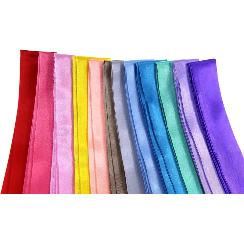 12 Set of narrow scarves by LilMents. Each scarf measures approximately 100cm / 39" long and 4.5cm / 1.75" wide. Suitable for use as a fashion neck scarf, hair tie, can be wrapped around objects such as handbags and many other uses.