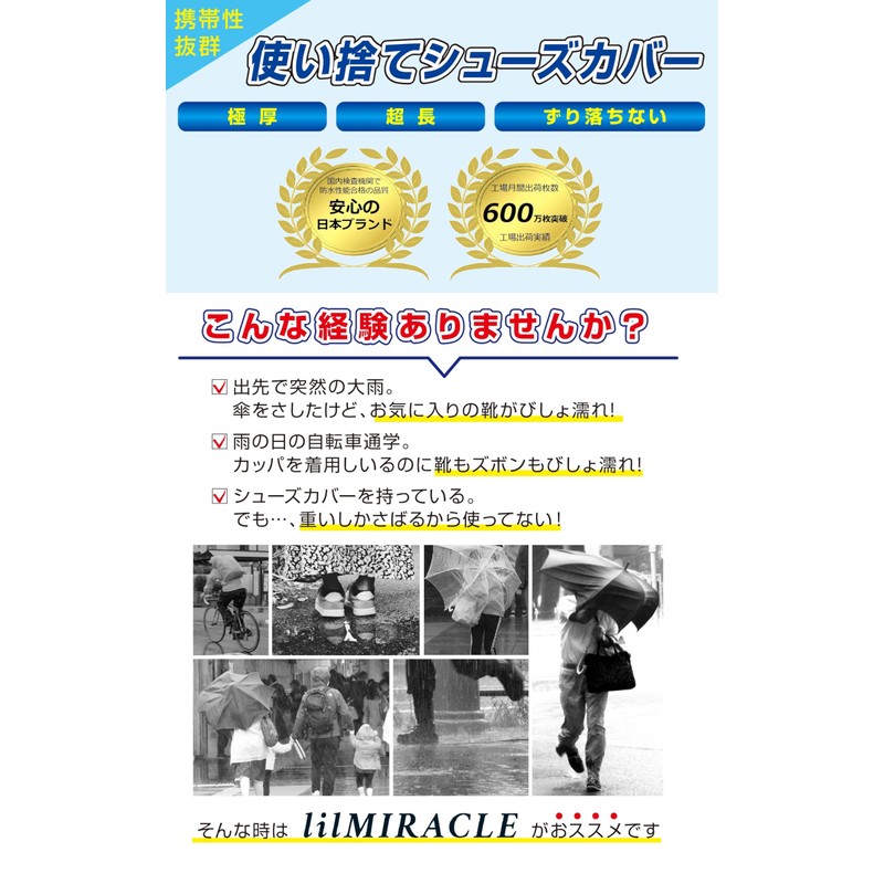- LilMIRACLE has its own 60-day warranty. If there is any defective in our disposable shoe cover, we will replace it and refund you immediately. It can also be used by those who "not thought of..." All our staff are Japanese and we always try our best to solve the problem of your customers. This product is not fully waterproof. We cannot guarantee problems with using this product other than the intended purpose, such as stains or damage to shoes or clothing caused by water penetration