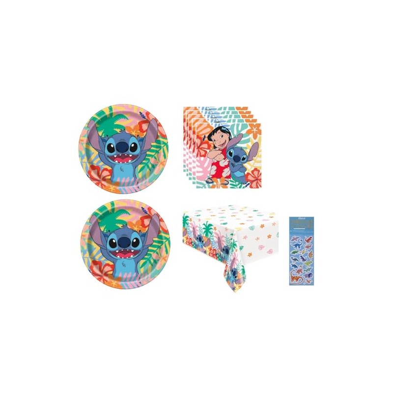 Lilo and Stitch Birthday Party Supplies Bundle includes 16 Paper Plates 7", 16 Paper Napkins, 1 Plastic Table Cover, 1 Dinosaur Sticker Sheet