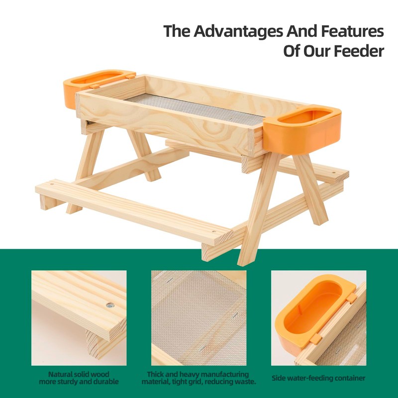 - Using Mesh Design:The bottom of this chicken picnic table feeder is made of stainless steel mesh, durable and won't rust. Even in rainy days, it can keep the food dry and fresh, avoiding poultry getting sick from eating wet food by mistake, easy to clean and meet daily feeding needs.