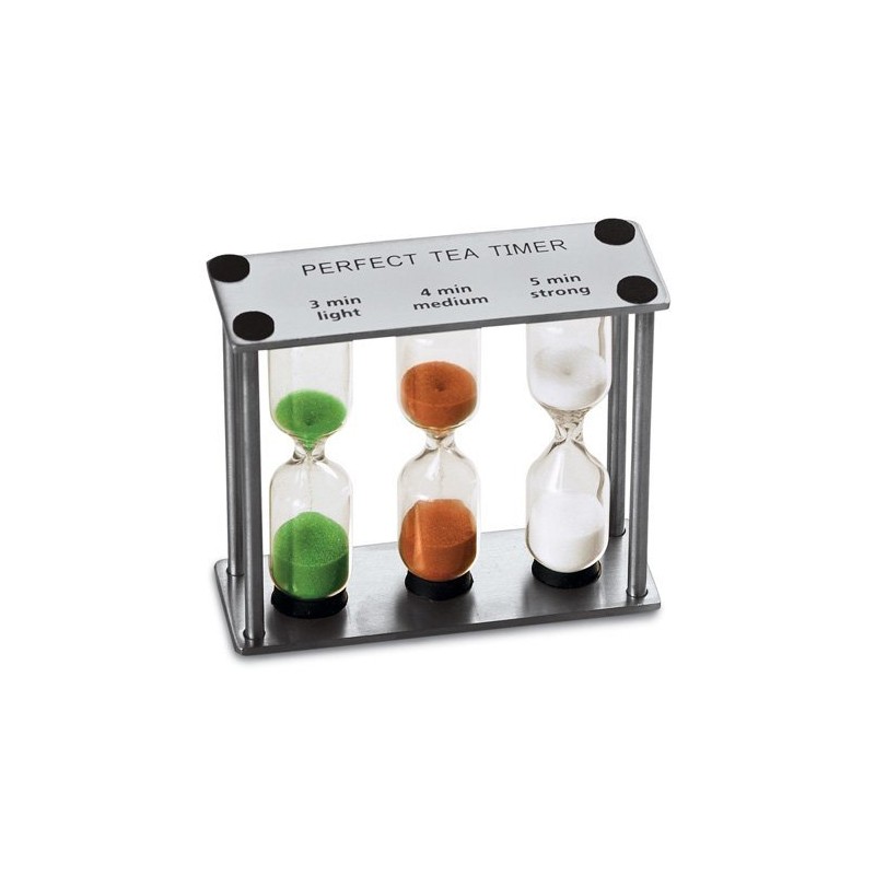 • PERFECT TIMING FOR ANY TEA: Three hourglasses provide 3-minute, 4-minute, and 5-minute timing. Use the 3-minute timing for a light brew, and the 4 or 5-minute timers for dark, stronger tea. Use with oolong and white, green and yellow tea leaves, or English breakfast, Earl Grey and other black teas.