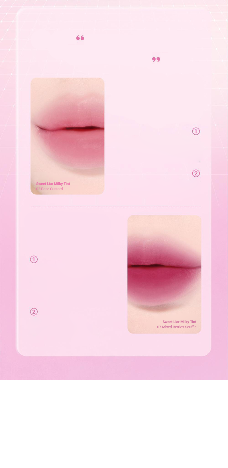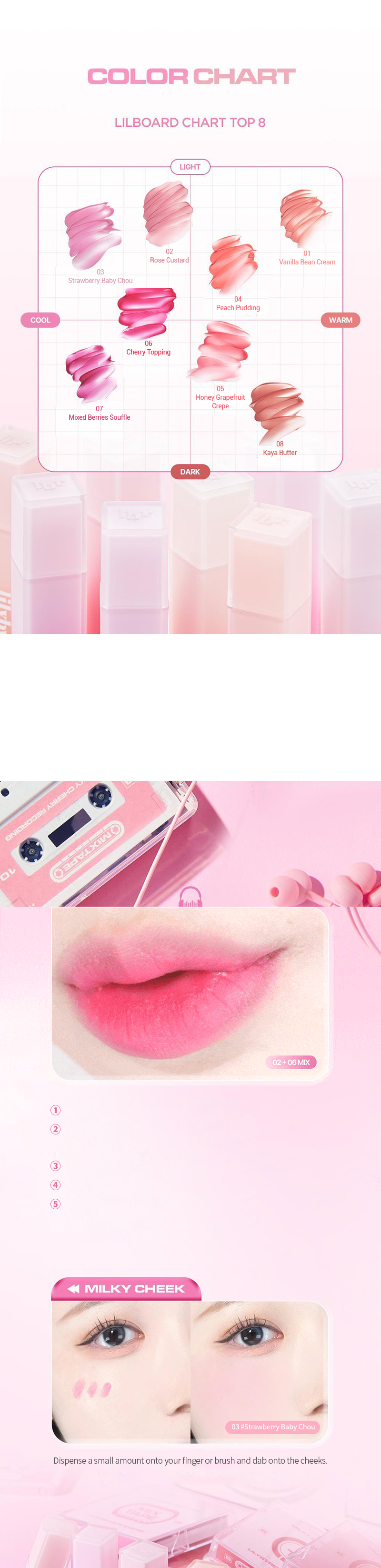 The pink mixtape formula provides sweet milky texture on lips. Provides bright milky coloring with moisturizing on lips that seems unreal. Provides milk foam-like soft and bright liveliness through milky coloring. Provides bright milky blurring effect with moisturizing and soft finish. The carefree application without lump or smudging provides easy blending and easy retouching through even milky texture.