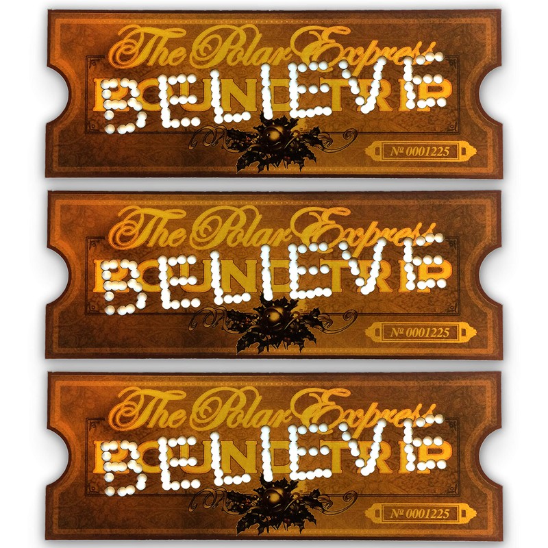 - The front of the ticket has an image of the First Gift of Christmas bell sitting on a bed of holly, the large ROUND TRIP printed in the center, and each ticket has the "No. 0001225" on the bottom right. The back of the ticket has the train forging on through the Christmas Eve moonlight, and the "No. 0001225" is centered underneath the image.