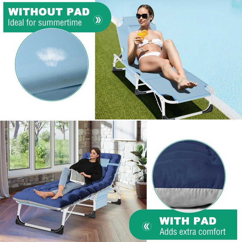 - FOLDING COT WITH FACE HOLE: This Versatile camping cot tanning chair features a convertible open/close face-down hole, arm slots, and a pillow. A practical sunbathing lounge chair suitable for outside, poolside, patio, lawn, garden, beach, etc. It can also be used as a camping cot, lounge chair, or guest bed.