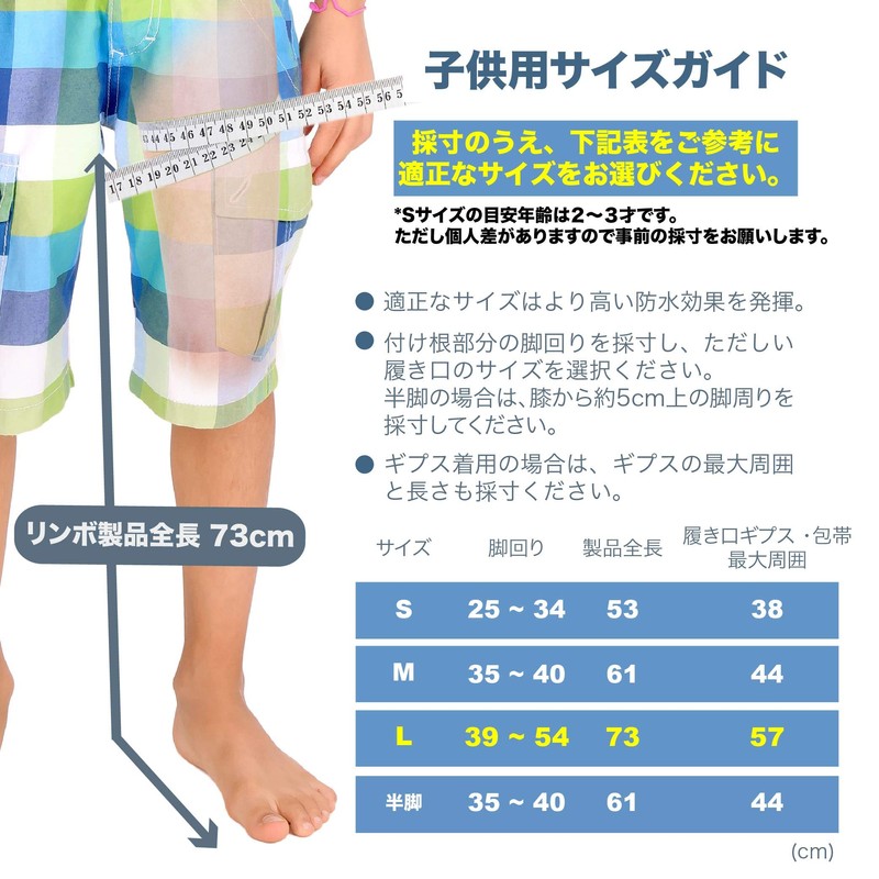 - Please refer to the photo size guide chart to choose the correct size for children; Size L: Base leg circumference 15.4 - 21.3 inches (39 - 54 cm); Opening - Gips; Maximum bandage circumference: 22.4 inches (57 cm); Product length: 28.7 inches (73 cm)