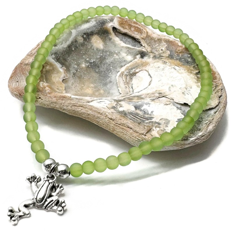 - Cute beaded anklet with small glass beads and a little silver plated frog charm, on strong elastic thread.