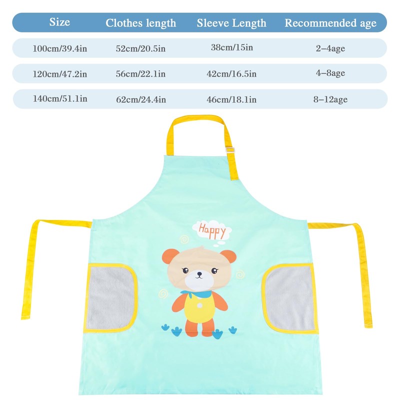 - ★ Size: This adjustable children's art apron comes in three sizes. Size M: 52cm/20.5in length (fits heights 80-100cm, ages 2-4), Size L: 56cm/22in length (fits heights 100-120cm, ages 4-8), Size XL: 62cm/24.4in length (fits heights 120-140cm, ages 8-12), The set includes matching sleeves with elastic cuffs that provide complete arm protection, making it ideal for messy creative activities like painting, crafts, and cooking, whether at home, school, or parties