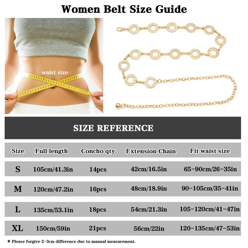 - ★ Size: Four lengths to choose from. Suitable for most people. S: total length 105cm/41.3in, suitable for people under 130 lb; M: total length 120cm/47.2in, suitable for people under 150 lb; L: total length 135cm/53.1in, suitable for people under 170 lb; XL: total length 150cm/59in, suitable for people under 190 lb. The diamond design of this metal waist chain not only elegantly enhances the curve of your waist, but also allows you to easily adjust the size, so you can wear it more freely