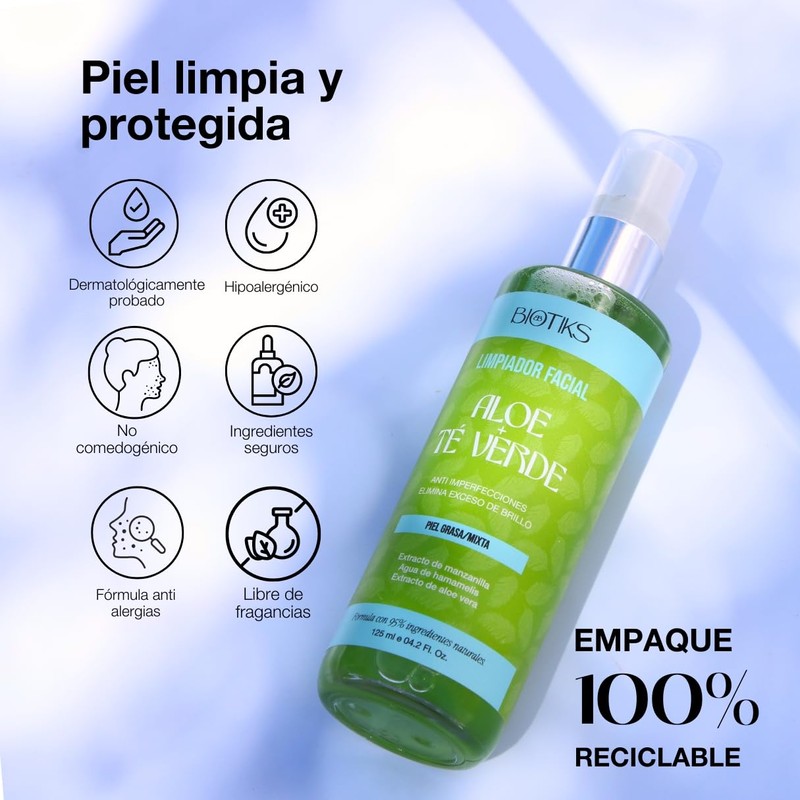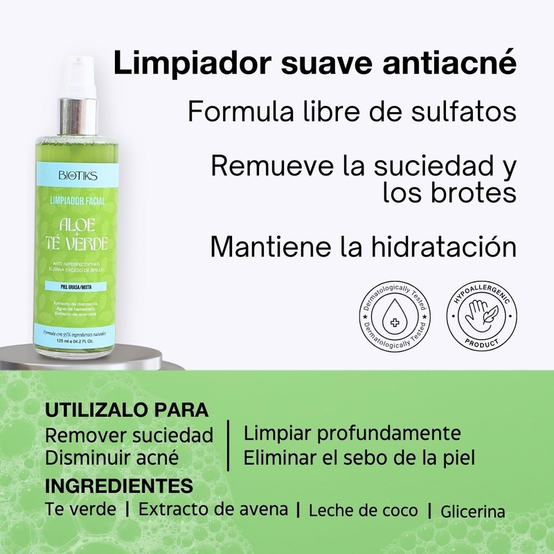Limpiador facial para piel grasa, antiimperfecciones, antiacné, con ale vera, leche de coco, y té verde. Limpia, hidrata, remueve suciedad y grasa. Piel matificada, libre de impurezas, saludable y radiante.