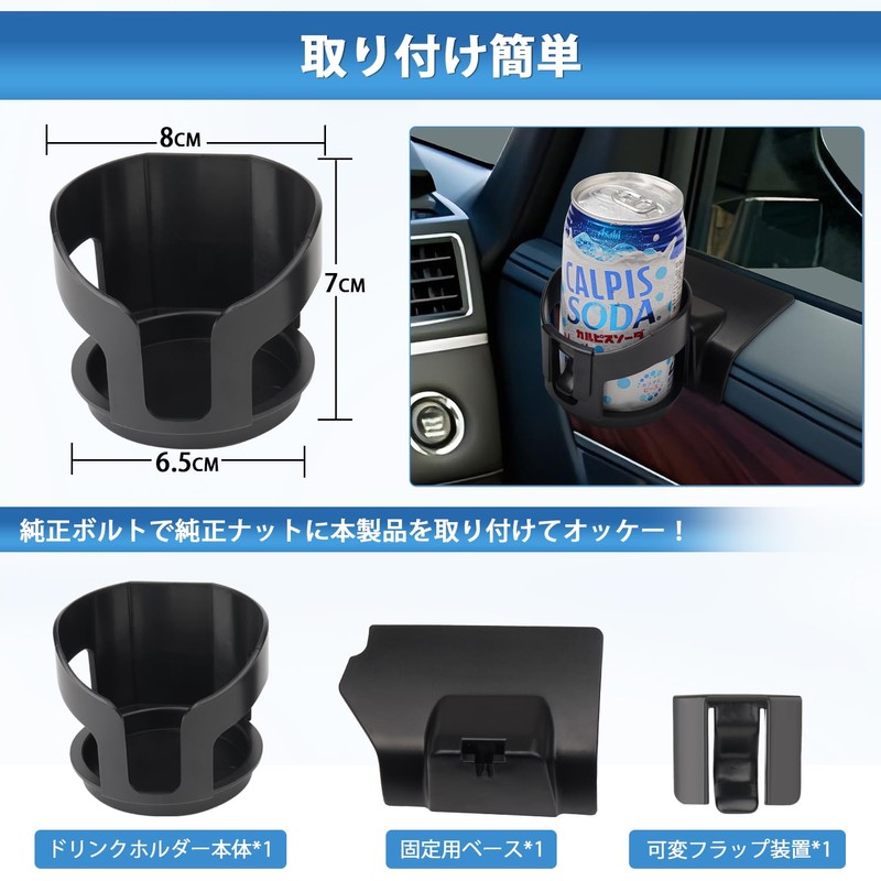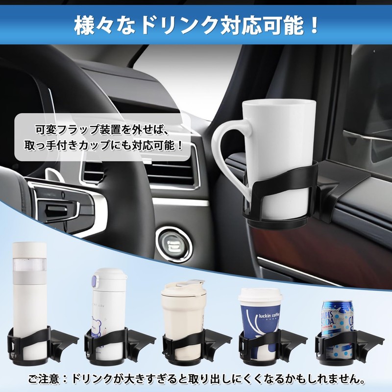 - 2. Compatible with Various Drinks: Comes with a variable flap device, so it is stable even when the car is swaking. You can also remove the variable flap device to hold the cup with handle. Note: If the drink is too large, it may be difficult to take out