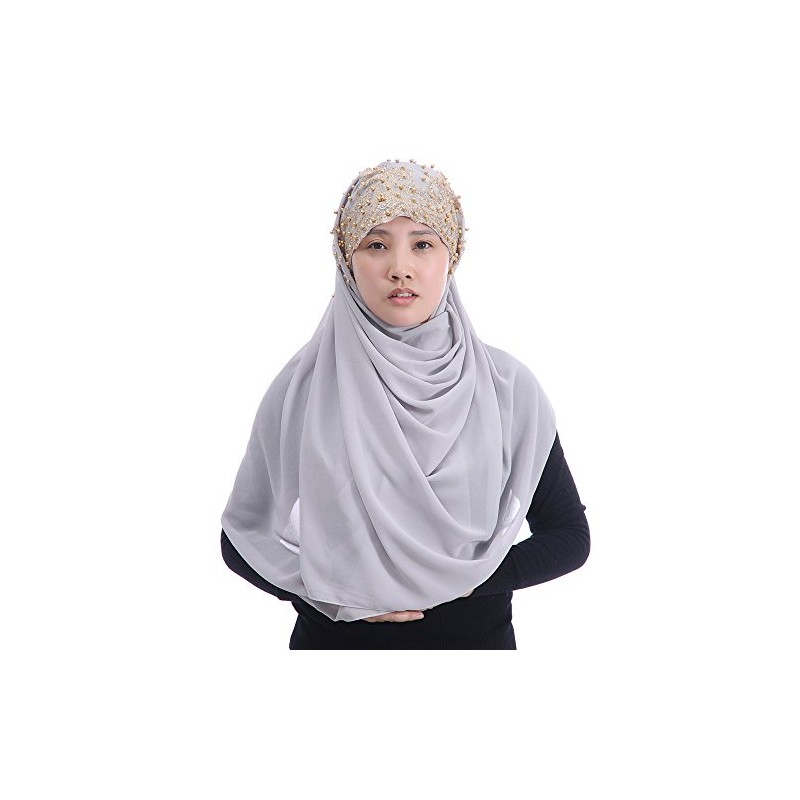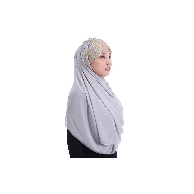 Lina & Lily Premium Chiffon Hijab Head Scarf Wrap with Gold Sequins Glitters Beads for Muslim Women (Silver)