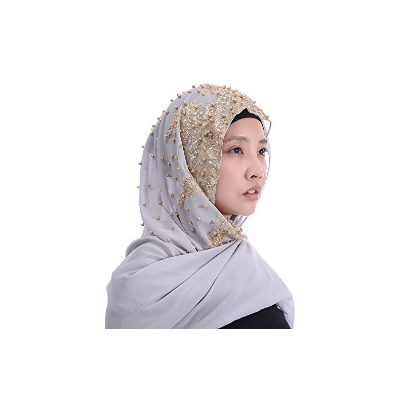 Lina & Lily Premium Chiffon Hijab Head Scarf Wrap with Gold Sequins Glitters Beads for Muslim Women (Silver)