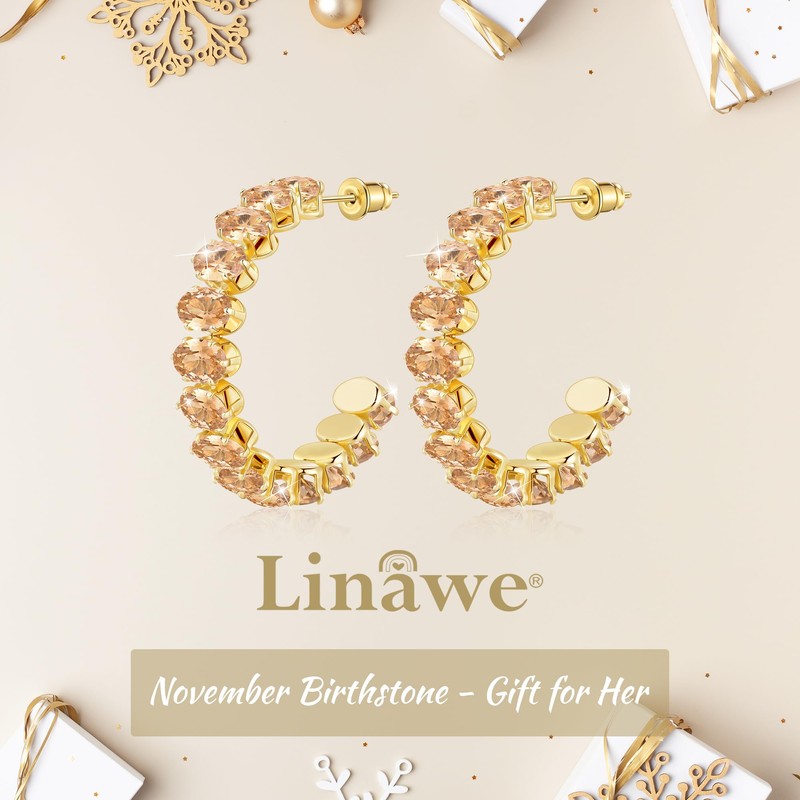 Linawe Champagne Chunky Gold Hoop Earrings for Women Trendy, Hypoallergenic Huggie Half Hoop Earrings, Thick Big Hoop Birthstone Earrings, Sparkly Rhinestone Citrine Crystal Hoops