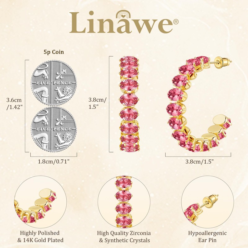 Linawe Chunky Gold Hoop Earrings for Women Trendy, Magenta Hot Pink Huggie Hoop Earrings, Hypoallergenic Birthstone Cubic Zirconia Rhinestone Imitation Diamond Large Big Half Hoop