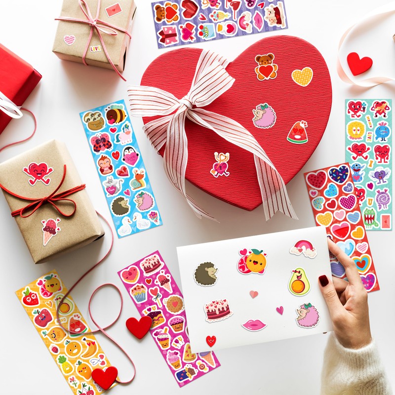 - Valentines Stickers Sheets for Kids - LINAYE Valentine’s Day stickers bulk includes 48 sheets(6 different styles) 720 Pieces Valentines stickers featuring cute animals, lovely fruits, desserts and various heart stickers which are available in various shapes and designs. Especially Designed For Kids. Let the kids express their love on Valentines Day with this over 720PCS Valentines Love Heart Stickers Pack!