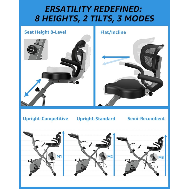 - 5-IN-1 MULTI-FUNCTIONAL EXERCISE BIKE WITH BREATHABLE SUPPORT: Transition effortlessly between three riding modes - from Upright-Competitive's cardio challenge to Semi-Recumbent's relaxed cruising and the classic Upright-Standard. Our upgraded ventilated mesh backrest elevates every position with airflow-rich comfort, offering 360° flexible support that keeps you cool during intense sessions while maintaining spinal alignment.