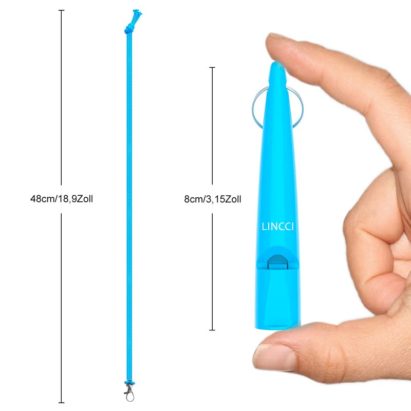 - Perfect design: our dog whistle is lightweight and small for easy carrying. The length of the whistle is 8 cm / 3.15 inches, the half-folded length of the lanyard is 48 cm / 18.9 inches. Ergonomic mouthpiece for easier and more comfortable blowing. The LINCCI dog whistle comes in 4 stylish colors to match your mood and outfits in daily life: black, orange, blue, red. All colours have the same frequency. It is a great gift for your family or friends.